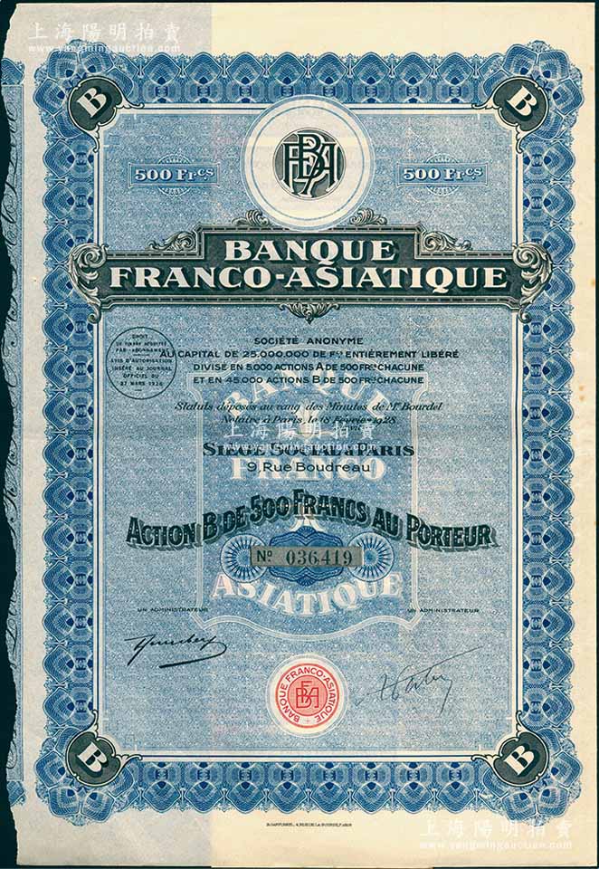 1928年法亚银行股票,蓝色B股500法郎,附带完整息票;中国外商银行老股票,该行在哈尔滨、沈阳等地开设有分行,一直经营到40年代;海外藏家出品,八五成新