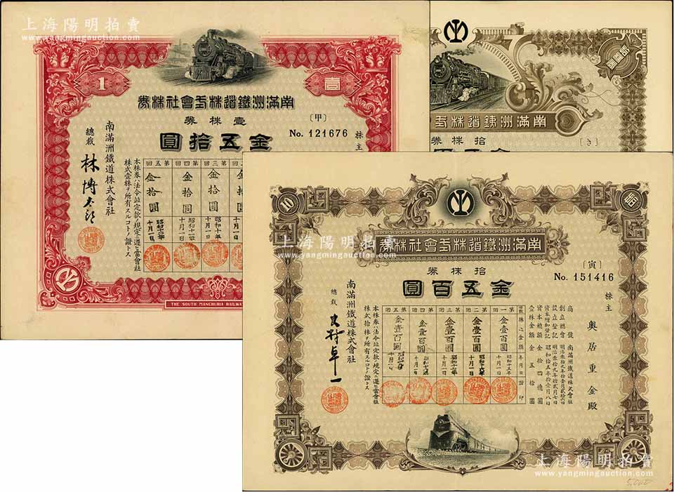 1920至1940年南满洲铁道株式会社株券共3种不同,详分:壹株券金五拾圆1枚,林博太郎签名版下火车图;拾株券金五百圆2枚,分别为仙石贡签名版上火车图、大村卓一签名版下火车图;海外藏家出品,八五至九成新