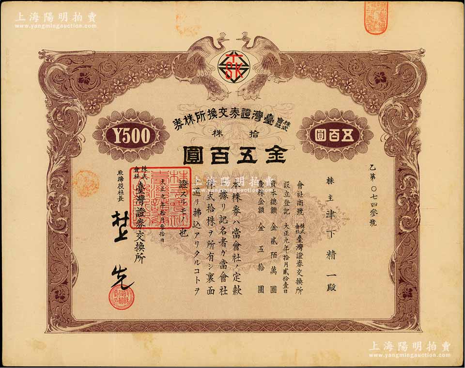 大正九年(1920年)株式会社台湾证券交换所株券,拾株金五百圆,上印双孔雀图,日本侵占台湾时期发行;此乃台湾最早的证券交易所老股票,存世珍罕,八成新
