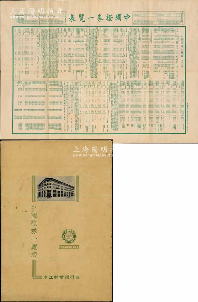 民国二十九年(1940年)浙江兴业银行编《中国证券一览表》1份,打开犹如海报状,内分为债券和股票两大部分,其债票部分包括国债、地方债及中国公司债券等诸多类别,而股票则分为中国公司、上海外商公司两个板块,资料翔实,对研究中国老股票和债券之发展极富参考价值,亦适合于展览和博物馆典藏,保存甚佳,敬请预览