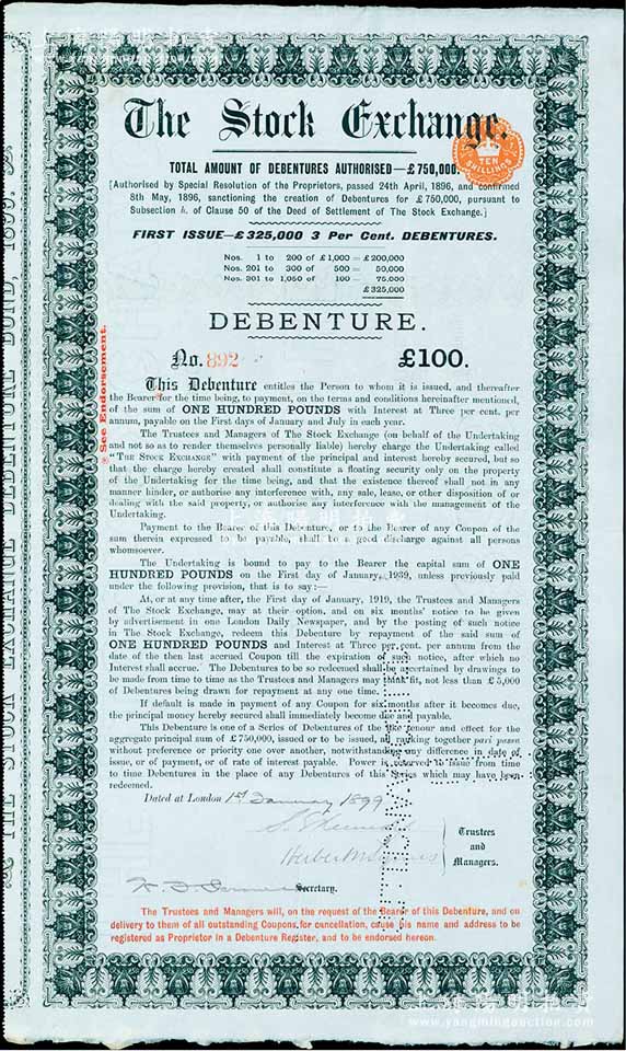 1899年(英国)伦敦证券交易所债券黑色100英镑,内有水印,罕见,八五成新
