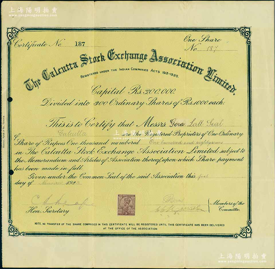 1923年印度加尔各答证券交易所股票,普通股1股计1000卢比,此乃该交易所之第一版股票,发行于英国殖民地时期(上贴英皇乔治税票1枚),存世罕见;该所成立于1908年,是南亚最古老的证券交易所,也是印度第二大交易所,仅次于孟买证券交易所;八成新