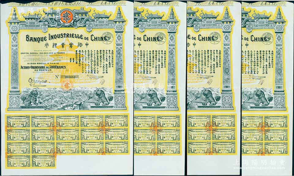 1920年中法实业银行股票500法郎共4枚连号,均附带有完整息票,图案精美,九成新