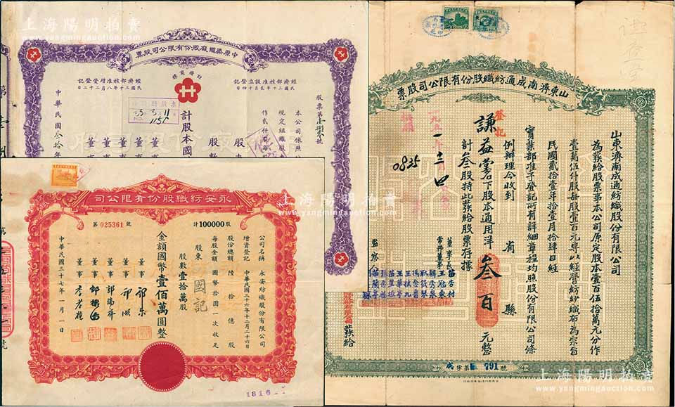 民国纺织业老股票3种,详分:1933年山东济南成通纺织股份有限公司股票,叁股计通用洋叁百元;1941年中原染织厂股份有限公司股票,拾股计国币壹仟圆;1948年永安纺织股份有限公司股票,壹拾万股计国币壹佰万圆;八成新