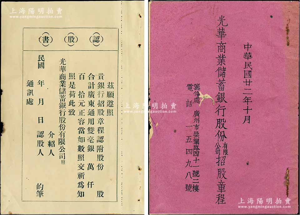民国廿二年(1933年)广州《光华商业储蓄银行股份有限公司招股章程》1册,该行资本广东通用毫银100万元,设总行于香港,设分行于广州、台山等地,内中详列缘起及总则、股份、业务、股东会、董事及监察人、职员、创办人等招股章程共十章29条,且附创办人及赞助人名单,另附认股书3张;少见且内涵丰富,保存尚佳,敬请预览