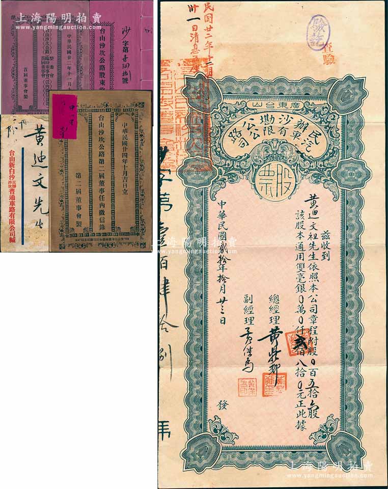 民国贰拾年(1931年)民办沙墈公路汽车有限公司股票,五拾六股计双毫银贰佰八拾元,附带原封套,及1933年、1935年《董事任内征信录》和1937年息摺各1册;广东台山地区老股票,罕见,八成新