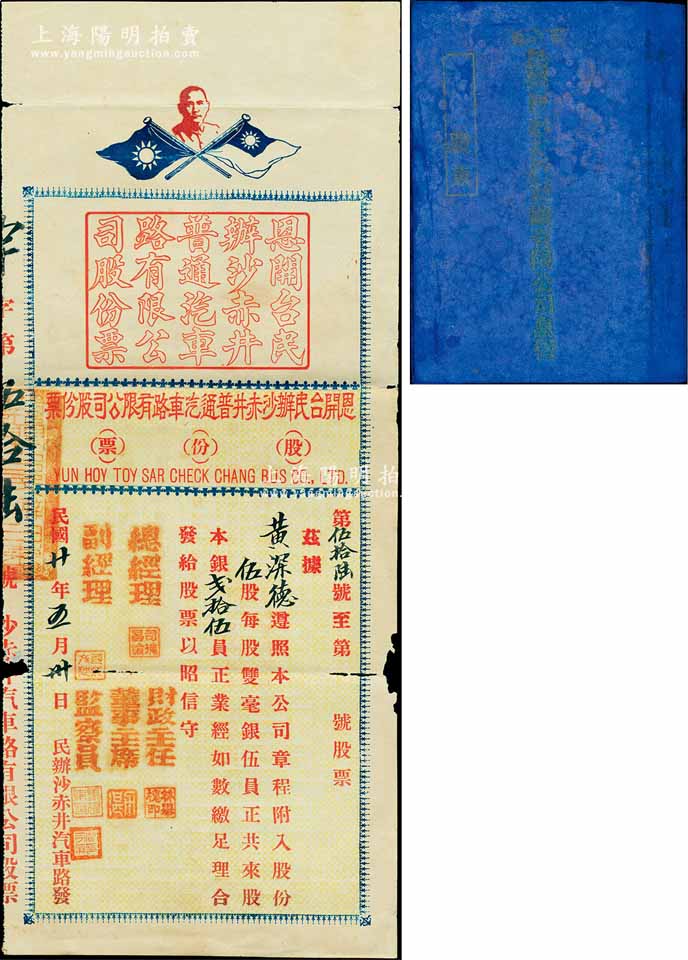 民国廿年(1931年)恩开台民办沙赤井普通汽车路有限公司股份票,伍股计银贰拾伍员,上印孙中山像和双旗,附带有息摺;此股票形制特殊,且存世罕见,七成新
