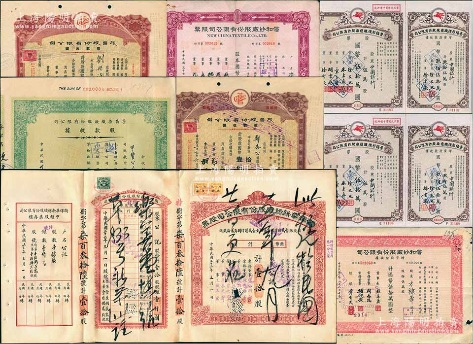 老股票8枚,详分:1933年卫辉华新纺织股份有限公司股票,壹拾股计国币壹仟圆;1942年孚昌染织厂股份有限公司股款收据,壹百股计中储券壹仟元;信和纱厂股份有限公司1947年增资股款收据伍万股计国币伍拾万圆、1948年股票伍万股计国币伍拾万元;景福衫袜织造厂股份有限公司股票2枚,面额均为伍万股计国币伍拾万圆;茂昌股份有限公司股款收据2枚,分别为1947年拾万股计国币壹佰万圆、1951年壹仟股计人民币壹万元;香港藏家出品,七至九成新