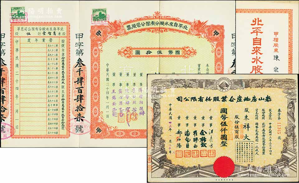 民国老股票2种,详分:1935年北平自来水股份有限公司股票,红色甲种伍股计国币伍拾圆,附带息单和封套;1944年泰山房地产企业股份有限公司股票,伍百股计国币伍仟圆(改值为壹佰股计国币壹仟圆);八五成新