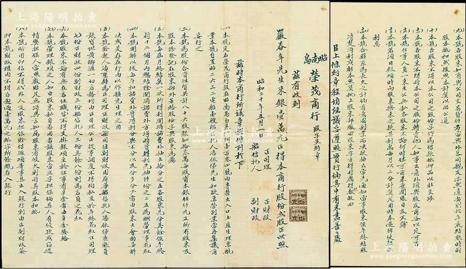 昭和二十年(1945年)昭南岛(即新加坡)荣茂商行股票,面额贰股计银壹万元,该行专营出入口土产生理兼航业等,内中详列章程条例共14条;南洋华侨之书写式传统老股票,发行于日本侵占新加坡时期;少见,有水印,八成新