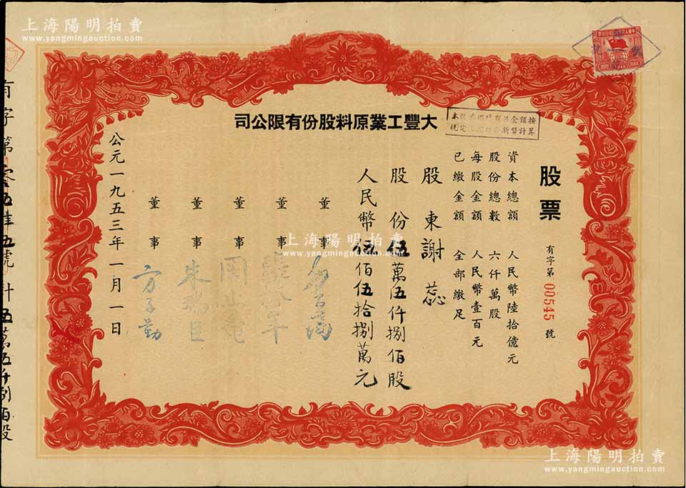 1953年(上海)大丰工业原料股份有限公司股票,伍万伍仟捌佰股计人民币伍佰伍拾捌万元,背印章程摘要,八成新