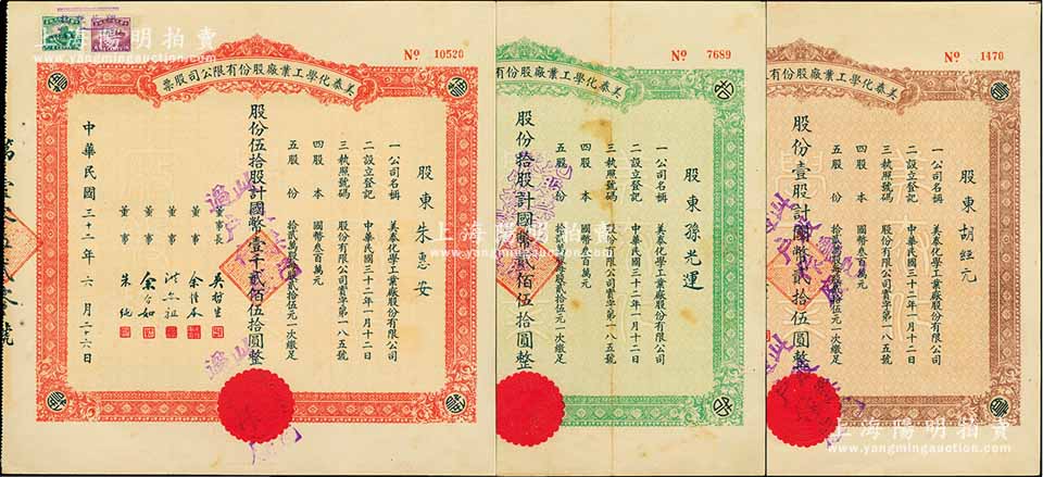 民国三十二年(1943年)美泰化学工业厂股份有限公司股票3种全套,详分:棕色壹股计国币贰拾伍圆、绿色拾股计国币贰佰伍拾圆、红色伍拾股计国币壹千贰佰伍拾圆,八成新