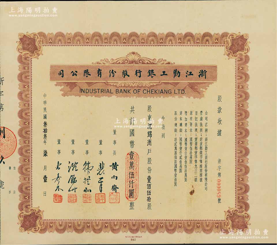 民国叁拾叁年(1944年)浙江劝工银行股份有限公司股款收据,壹佰伍拾股计国币壹万伍仟圆,承购股东即为票上董事沈锦洲氏;中国银行业老股票之珍罕品,八五成新
