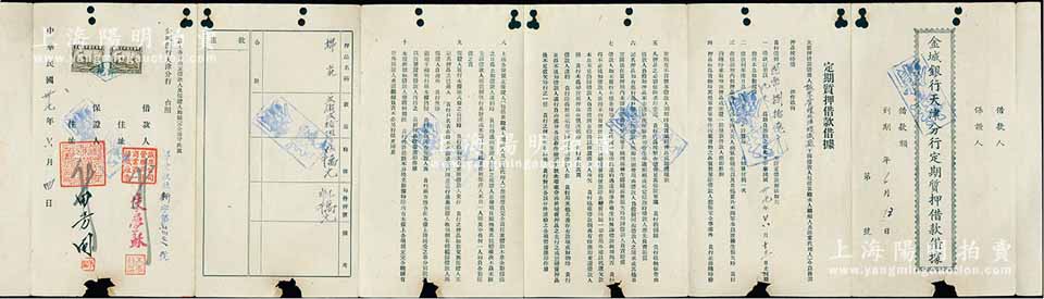 民国卅七年(1948年)金城银行天津分行定期质押借款借据1份,借给诚孚公司管理北洋商业第一纺织厂国币捌拾亿元,为期九天,月息21分,而对方则以250担棉花作为抵押品;此种民国银行之抵押借据内涵丰富,颇具史料研究价值,七五成新