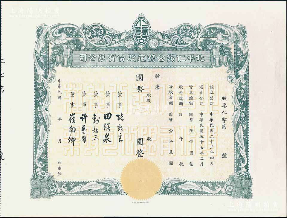民国年(1948-)北平仁发公钱庄股份有限公司股票,未填用发行,附存根;仁发公银号成立于1933年,其董事长即为山西晋绥军将领王靖国氏,九五成新