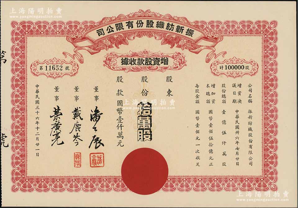 民国三十六年(1947年)振新纺织股份有限公司增资股款收据,拾万股计国币壹仟万元;该公司为荣氏家族企业,票上董事潘公展曾任上海《晨报》社长、《申报》董事长、国民党中央宣传部副部长等职,九成新