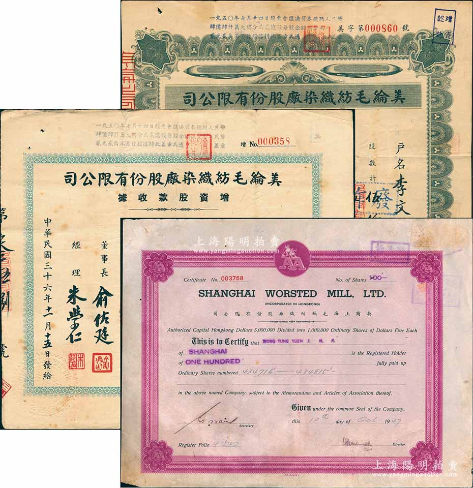 老上海股票3种,详分:1947年英商上海毛绒纺织厂股份有限公司股票,面额100股(每股5元),老上海著名外商企业;1947年美纶毛纺织染厂股份有限公司股款收据伍仟股计伍万元、增资股款收据玖万股陆仟股计国币玖拾陆万圆;七至八成新