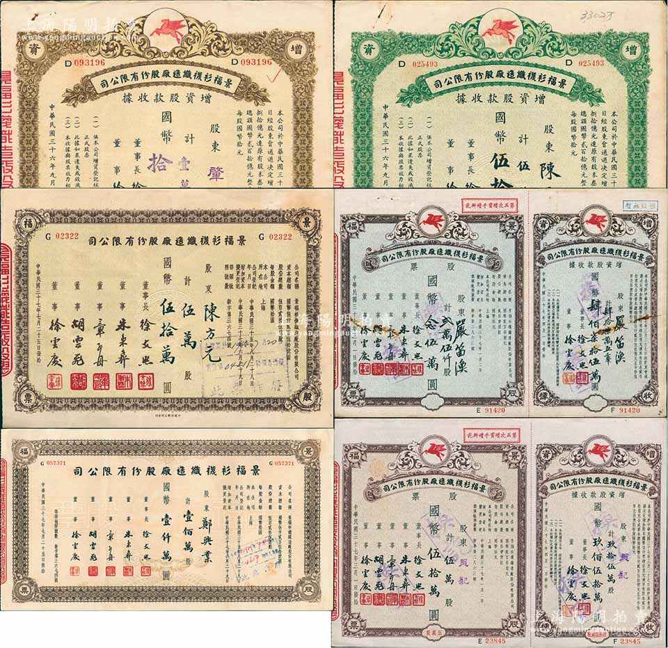 景福衫袜织造厂股份有限公司股票6种,详分:1947年增资股款收据壹万股计国币拾万圆、伍万股计国币伍拾万圆;1948年伍万股计国币伍拾万圆、贰万伍仟股计国币念伍万圆(附带增资股款收据)、伍万股计国币伍拾万圆(附带增资股款收据)、壹佰万计国币壹仟万圆;八至九成新