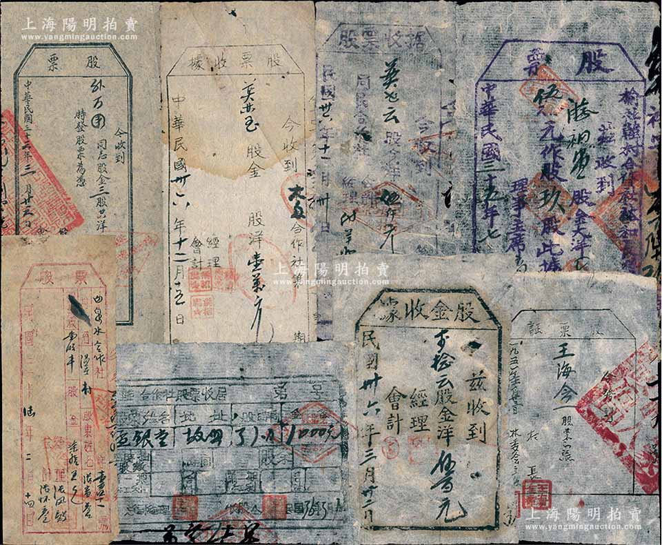晋冀鲁豫解放区老股票等8种,详分:1944年保证责任磁武县第六区混合业务联合社股票,三股共洋叁佰元;1946年榆社韩村合作社裕和长股票,玖股计大洋肆百伍拾元;1947年白泉水合作社股票,壹股半计柒拾五元;1947年同民合作社股票股金洋伍仟元;1947年股金收据洋伍百元;1947年股票收据股洋壹万元;1947年县合作社股票收据1000元;1951年股票证1股;七至八成新,敬请预览