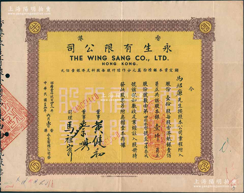 民国三十七年(1948年)香港永生有限公司股票,壹拾股计银壹仟员,该公司由香港商业巨子蔡兴所创办,票上有其手签名;香港藏家出品,八成新