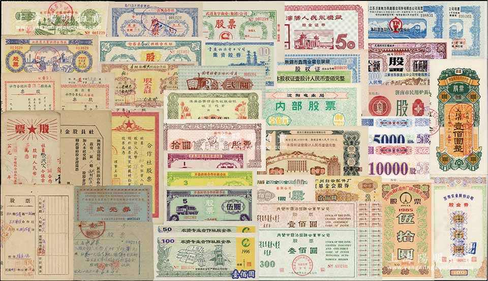 1946至1998年中国老股票藏品集1册共102枚不同,内中除1枚为1946年山东解放区招北县民生酱园合作社股票外,其余均为1951至1998年新中国老股票,内容以合作社题材为主,品种丰富,难以细述,品相约七成至全新不等,敬请预览
