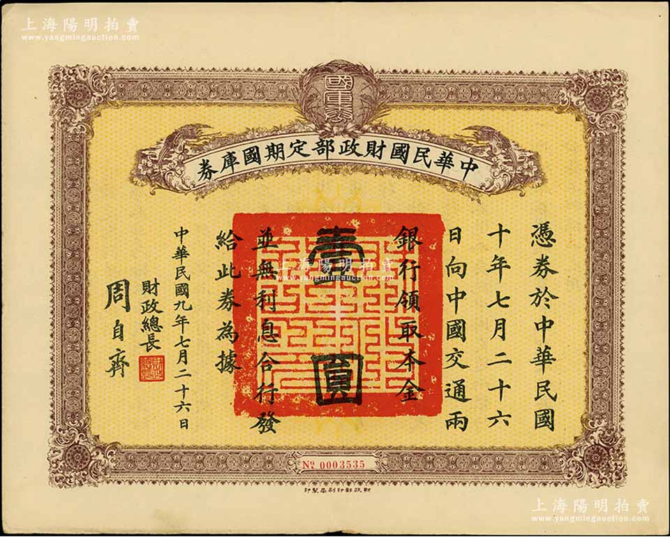 民国九年7月26日(1920年)中华民国财政部定期国库券壹圆,由财政总长周自齐签署,前辈藏家出品,八五成新