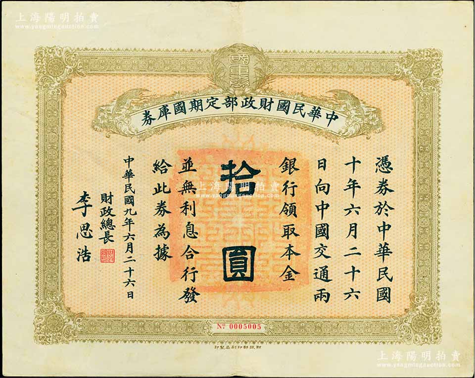 民国九年6月26日(1920年)中华民国财政部定期国库券拾圆,由财政总长李思浩(浙江慈溪人)签名,前辈藏家出品,八五成新
