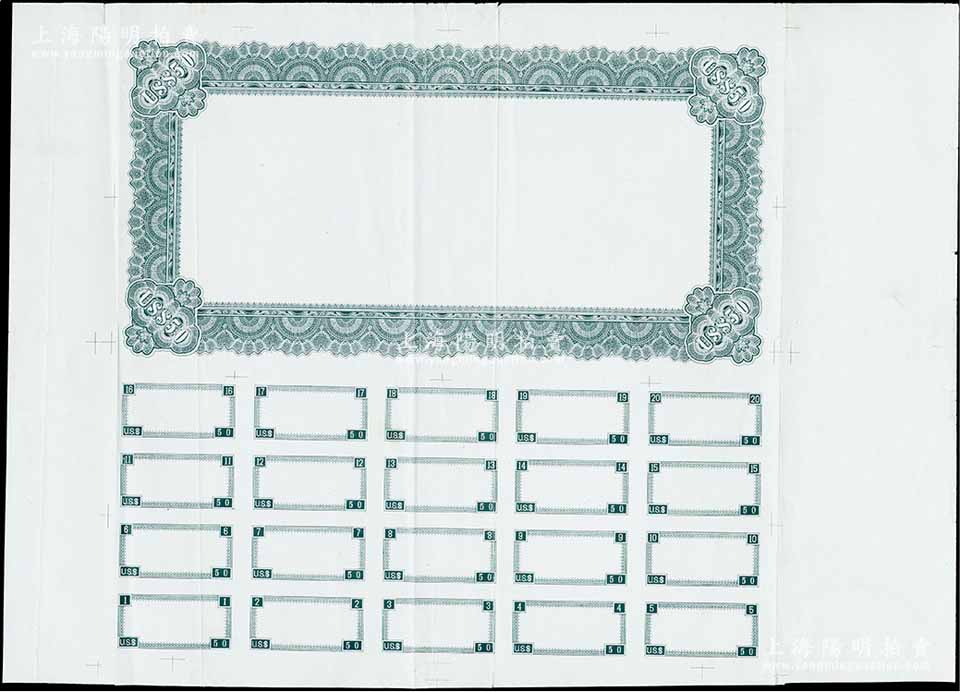 民国三十六年第一期美金公债·美金伍拾圆之背面黑白设计样稿,少见,八成新