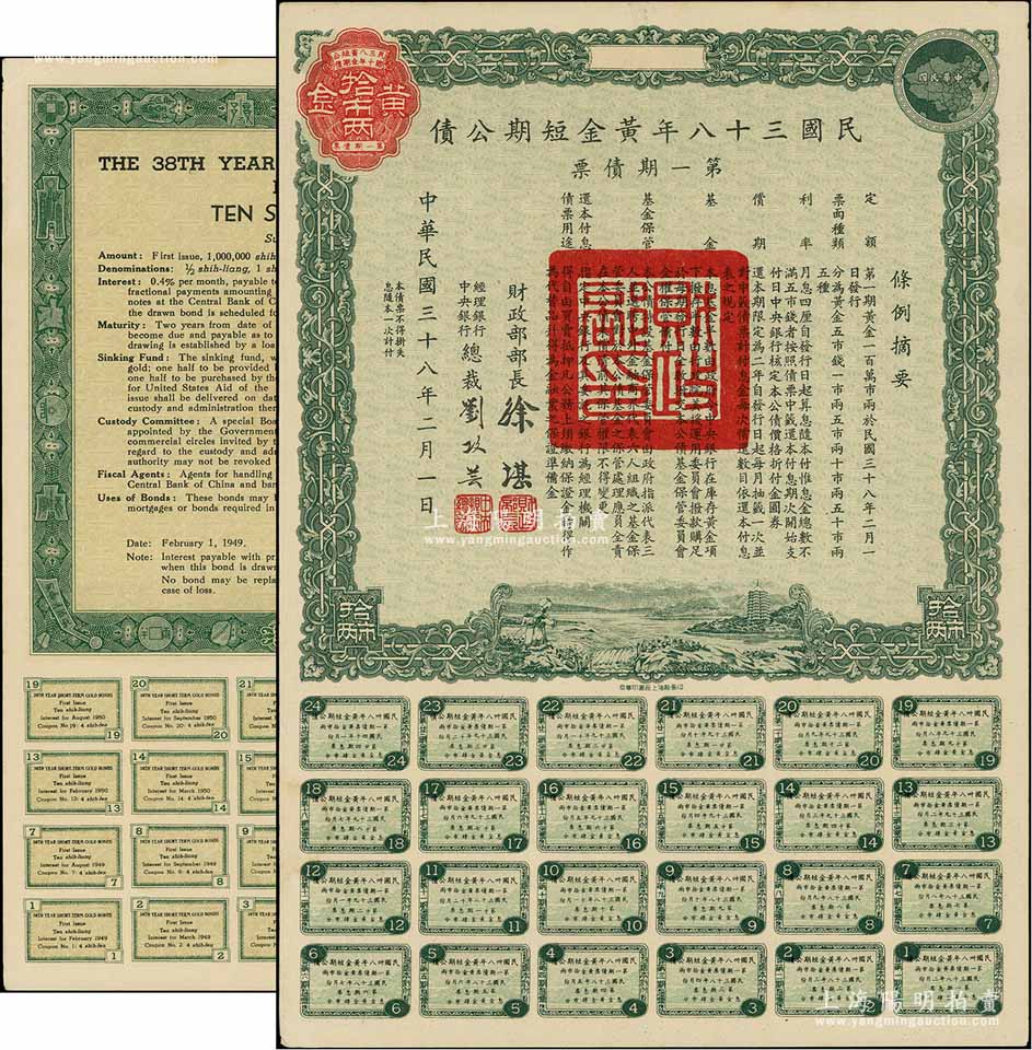 民国三十八年黄金短期公债·第一期债票·黄金拾市两,乃唯一以黄金为单位的债券,发行不到四月即因解放而终止;前辈藏家出品,罕见,九成新