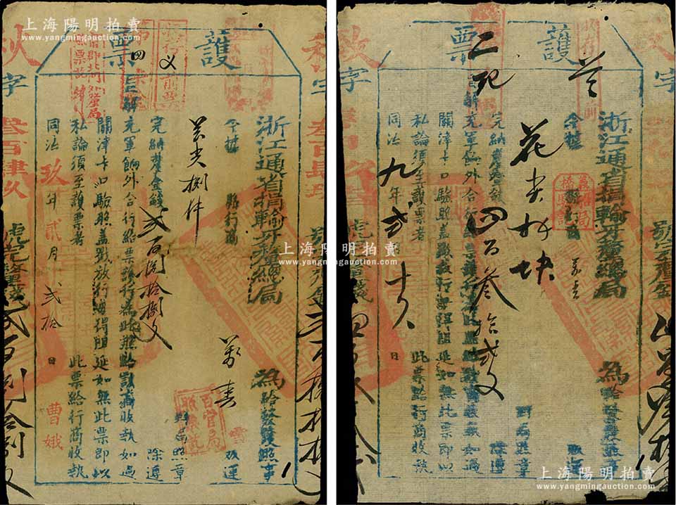 同治九年(1870年)浙江通省捐输牙厘总局“护票”共2张不同,均发行于绍兴府一带,颁给行商贩运“花尖”(即茶叶),各完纳厘金钱288文和432文,言明“遵旨解充军饷”和“如过关津卡口验照盖戳放行”等情;此乃清代“茶叶”厘金制度之历史实证,亦属晚清军事方面之捐输实物,颇具史料研究价值,少见且保存甚佳,敬请预览