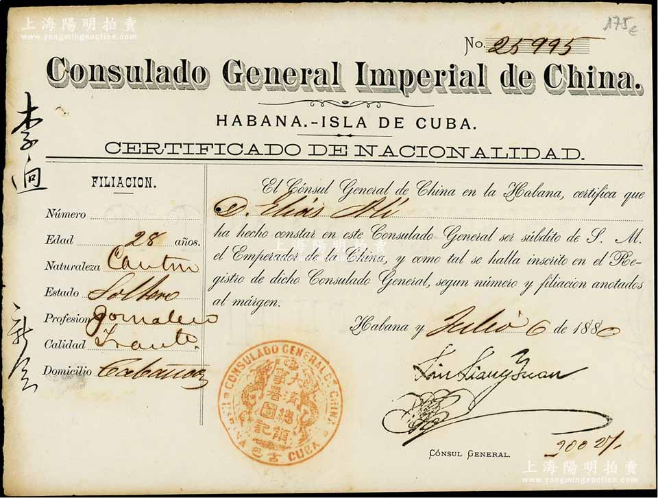 1880年大清国驻古巴领事馆颁发之中国侨民“护照”1张,发给广东新会籍李迥氏,上盖“大清总领事署图记”双龙图印戳,有水印,保存极佳,敬请预览
