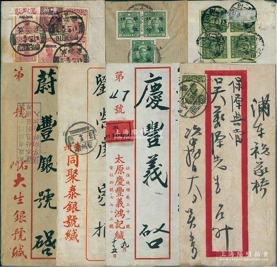 民国时期各银号等中式红条实寄封共7个不同,内含:上海浦东保源典当、天津华丰号、天津裕东银号、太原庆丰义、曹州同聚泰银号、石门大生银号等,其中1个为成都寄往上海日昇昌宝号(山西著名票号)收,均贴票完整,保存甚佳,敬请预览