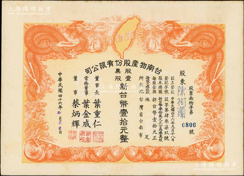 1957年台南物产股份有限公司股票,壹股计新台币壹拾元,上印双龙戏珠及宝岛地图极为美观,九成新