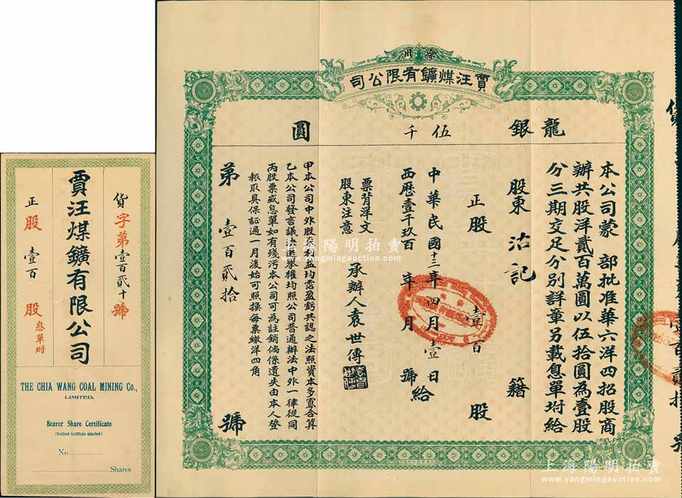 民国十三年(1924年)徐州贾汪煤矿有限公司股票,正股壹百股计龙银伍千圆,票上承办人袁世传乃民国大总统袁世凯之堂弟,另附带有封套和股息单;少见,八五成新
