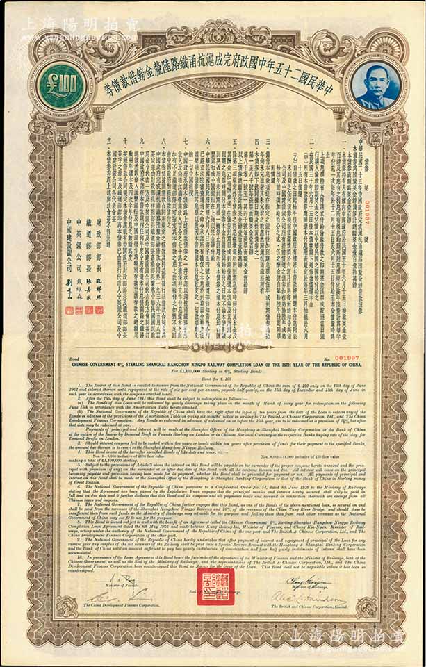 民国二十五年中国政府完成沪杭甬铁路陆厘金镑借款债券100英镑,八五成新