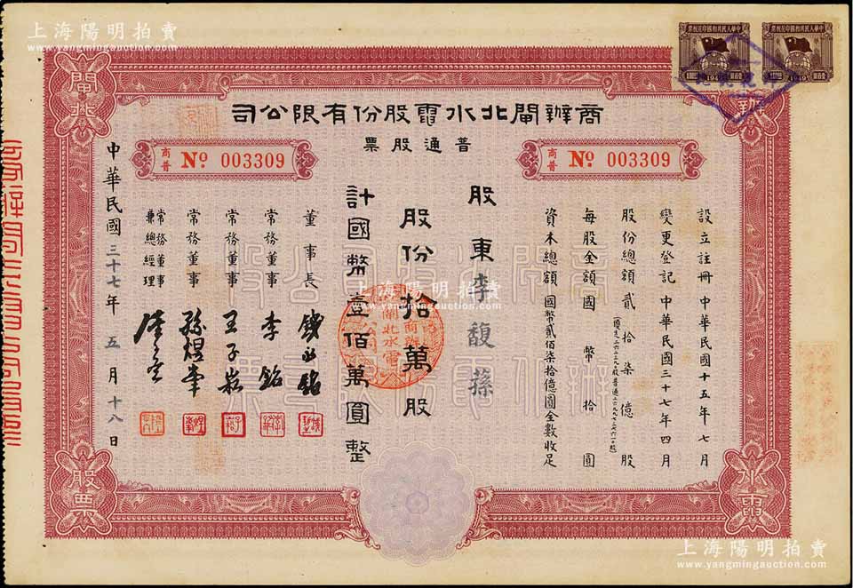 民国三十七年(1948年)商办闸北水电股份有限公司普通股票,拾万股计国币壹佰万圆,其承购股东李馥荪氏即为常务董事李铭(江浙财阀代表人物,浙江实业银行董事长兼总经理),八五成新