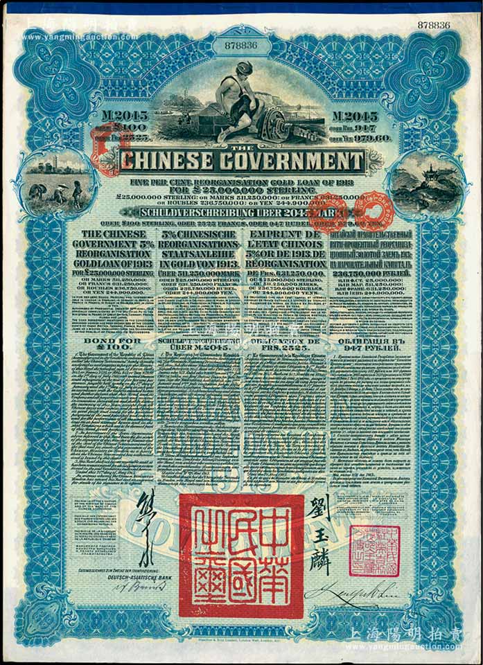 1913年中华民国政府向五国银行团善后大借款公债2045马克,由德华银行(Deutsch-Asiatische Bank)代理发行,蓝色印刷,由北洋政府总理兼财政总长熊希龄、驻英公使刘玉麟签署,九成新