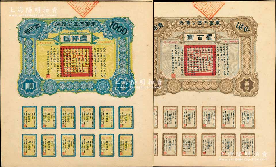 民国六年(1917年)军事内国公债券壹百圆、壹仟圆共2枚全套,由广东军政府发行,廖仲恺签署;海外藏家出品,九五成新