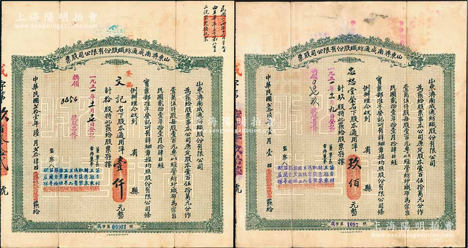 山东济南成通纺织股份有限公司股票共2枚不同,详分:1932年拾股计通用洋壹仟元、1937年玖股计通用洋玖佰元,票上董事苗星垣(桓台人)为工商实业家,曾任济南市政协常委,背印股票简章等;八成新