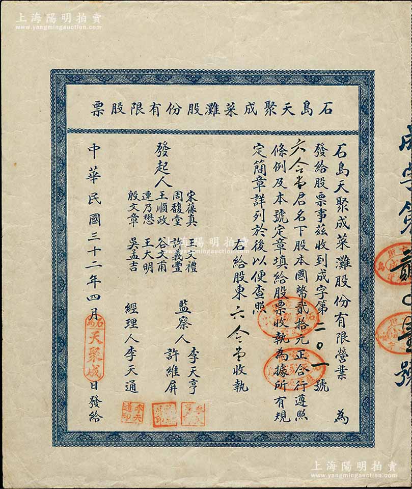 民国三十二年(1943年)石岛天聚成菜滩股份有限股票,股本国币贰拾元,背印附简章十则;山东荣成县老股票,八成新