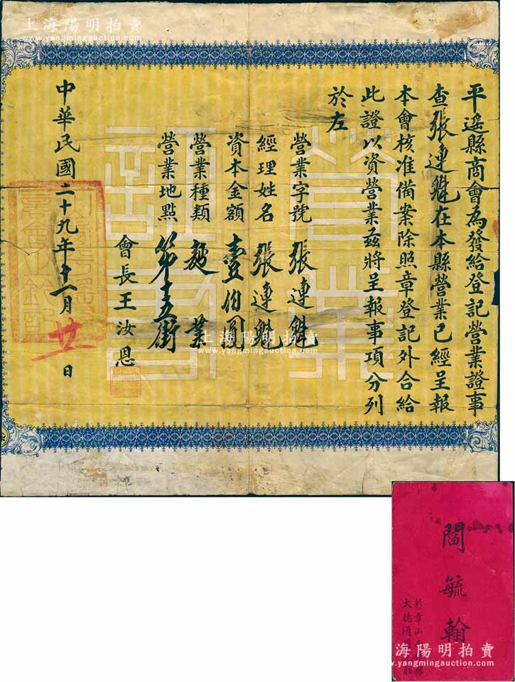 民国二十九年(1940年)“平遥县商会登记营业证”1张,颁给“面业”张连魁氏,资本金额壹佰圆;另附有山西“十大票号”之一祁县“大德通汇兑庄”名刺1枚;保存尚佳,敬请预览