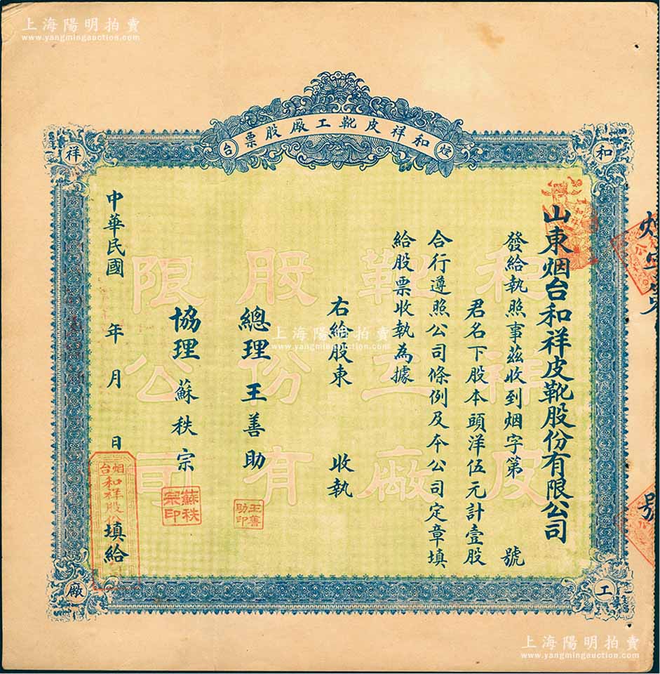 民国年(1924-)山东烟台·和祥皮靴工厂股票,头洋伍元计壹股,背印招股简章,少见,八五成新