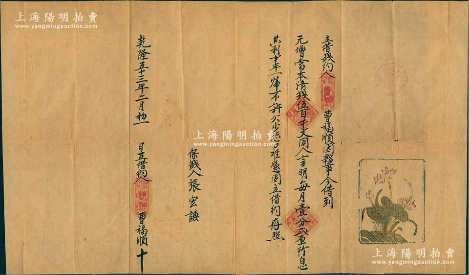 乾隆五十三年(1788年)传统“借钱约”一份,内有源丰号曹福顺因夥事,借到元增当本清钱伍百千文,言明月息壹分贰厘,限定半年归还本息;此种“乾隆朝”借约可能是迄今所见清代最早之借款合同,罕见且保存甚佳,敬请预览