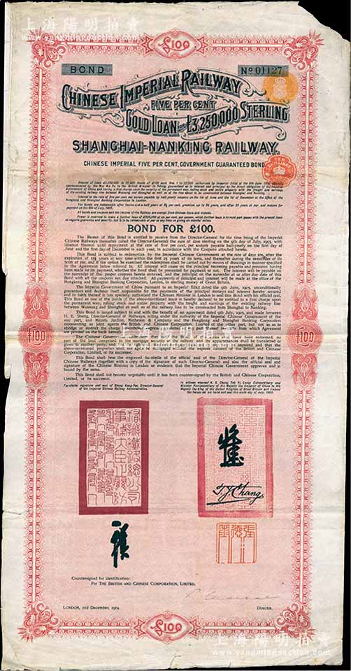 1904年大清帝国政府对外发行沪宁(上海至南京)铁路债券100英镑,由伦敦中英公司(British & Chinese Co. Ltd.)代理发行,上有铁路大臣盛宣怀和驻英公使张德彝之关防和签押;海外藏家出品,七五成新