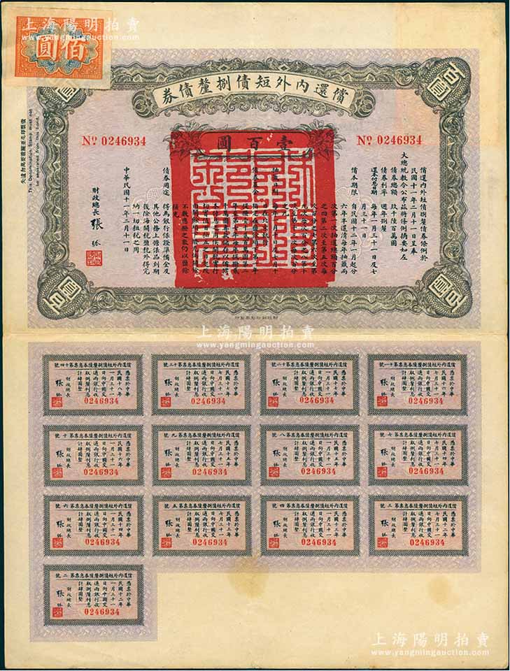 民国十一年(1922年)偿还内外短债捌厘债券(史称“九六公债”)壹百圆,由财政总长张弧签署,附带有完整息票,八五成新