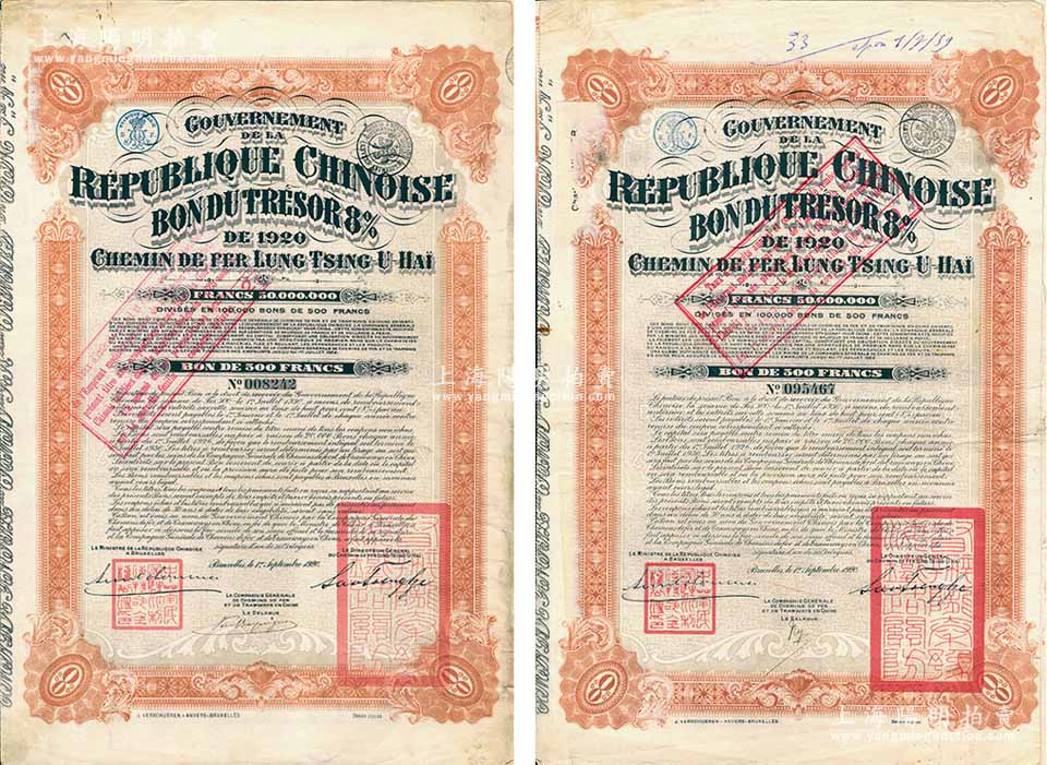 1920年中国政府对外发行督办陇秦豫海铁路公债500法郎共2枚不同手签名,在比利时发行,票上印有“中华民国驻比利时特命全权公使印”,均附带有息票;海外藏家出品,八成新