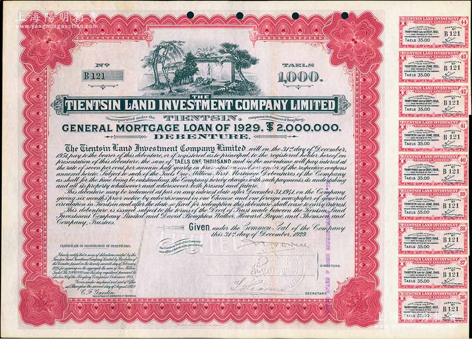 1929年天津先农坛地产公司债券1000两,属天津英商地产公司,上印北京先农坛图,附带有息票,八成新