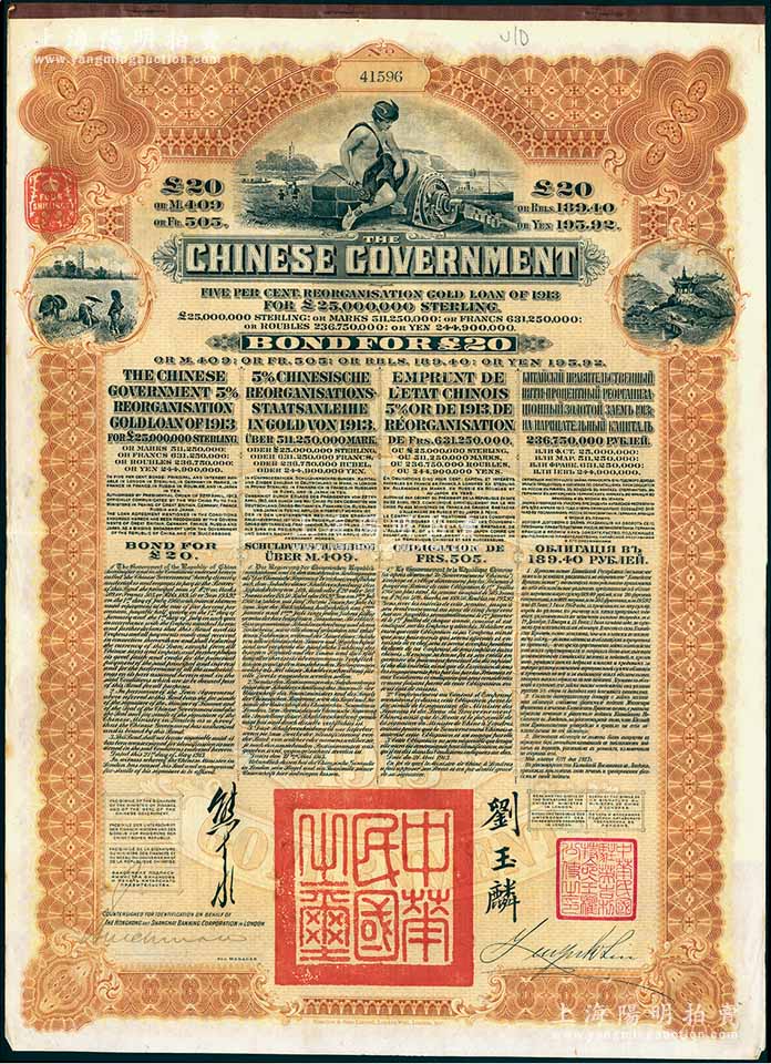 1913年中华民国政府向五国银行团善后大借款公债20英镑,棕色印刷,英商香港上海汇丰银行(Hong Kong & Shanghai Banking Corporation)代理发行,由北洋政府总理兼财政总长熊希龄、驻英公使刘玉麟签署,八五成新