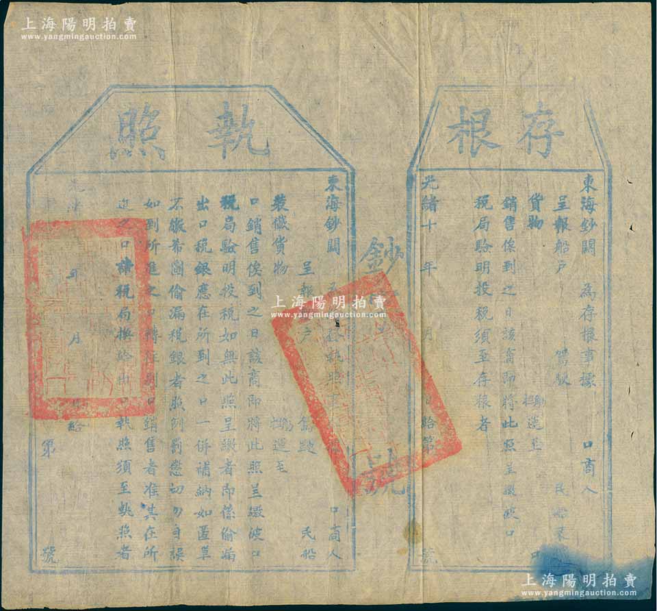 光绪十年(1884-)“东海钞关执照”1份,未填用附存根,以备商人呈报货物及缴纳出口税之用,钤有官印两处;东海钞关,又称东海关,同治二年(1863年)设于烟台,由英国人汉南充任第一任税务司;保存甚佳,敬请预览