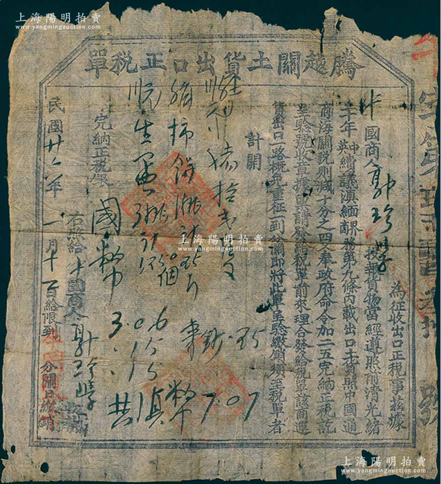 民国廿六年(1937年)云南“腾越关土货出口正税单”1张,由中国商人出口柿饼、生蛋等物,遵照前清光绪二十年中英续议滇缅商务等,完纳正税银滇币7.07元等情,保存尚可,敬请预览